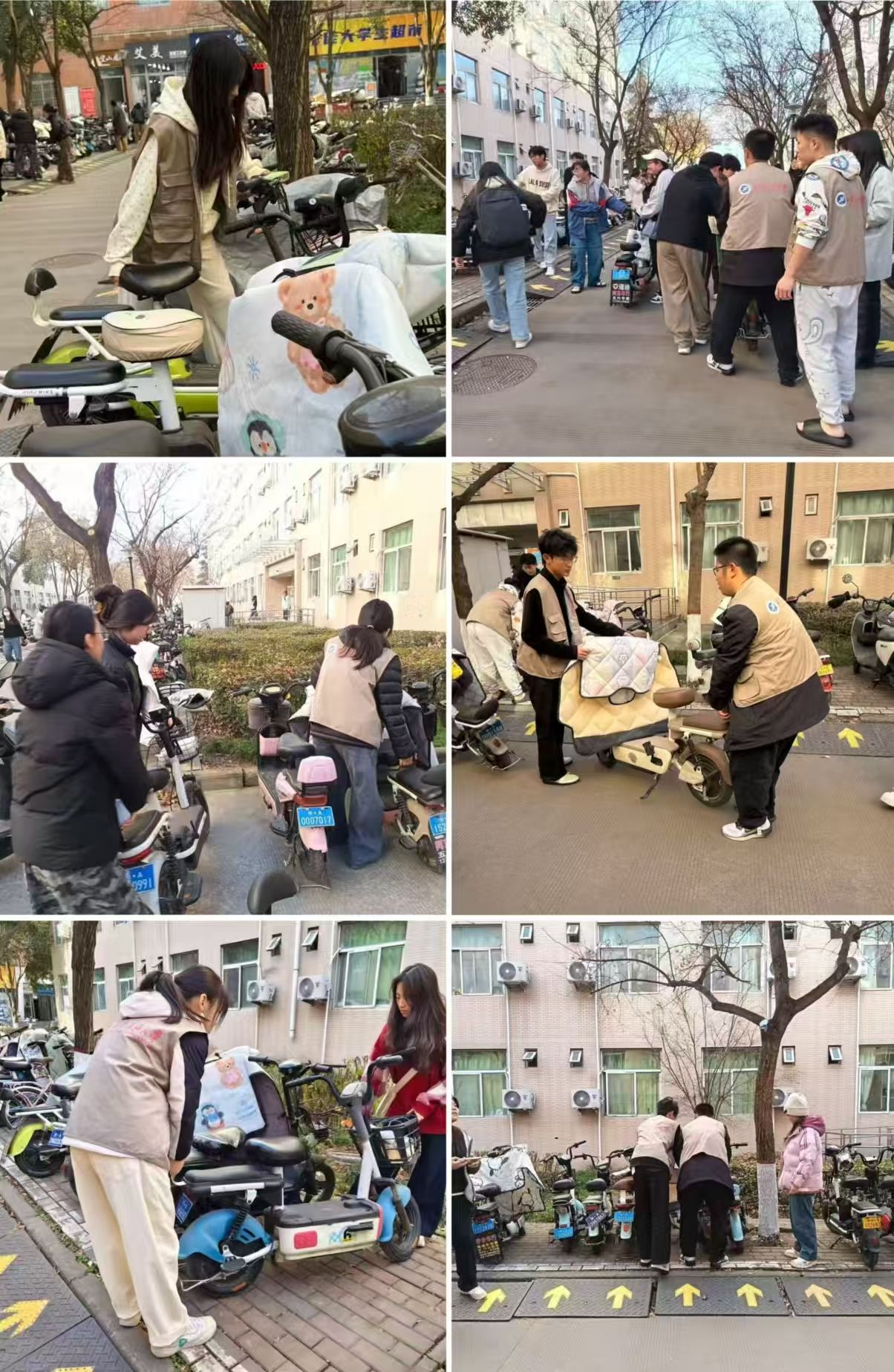 下午13点,志愿者们来到南区7号宿舍楼下,面对停放不规范的车辆,大家两三人一组,分工协作,将歪斜的电动车一一扶正,把停放在消防通道、人行道上的车辆小心移至划定的停车区域,并按照车头朝向一致的标准进行排列,让原本杂乱的停车区域变得井然有序。