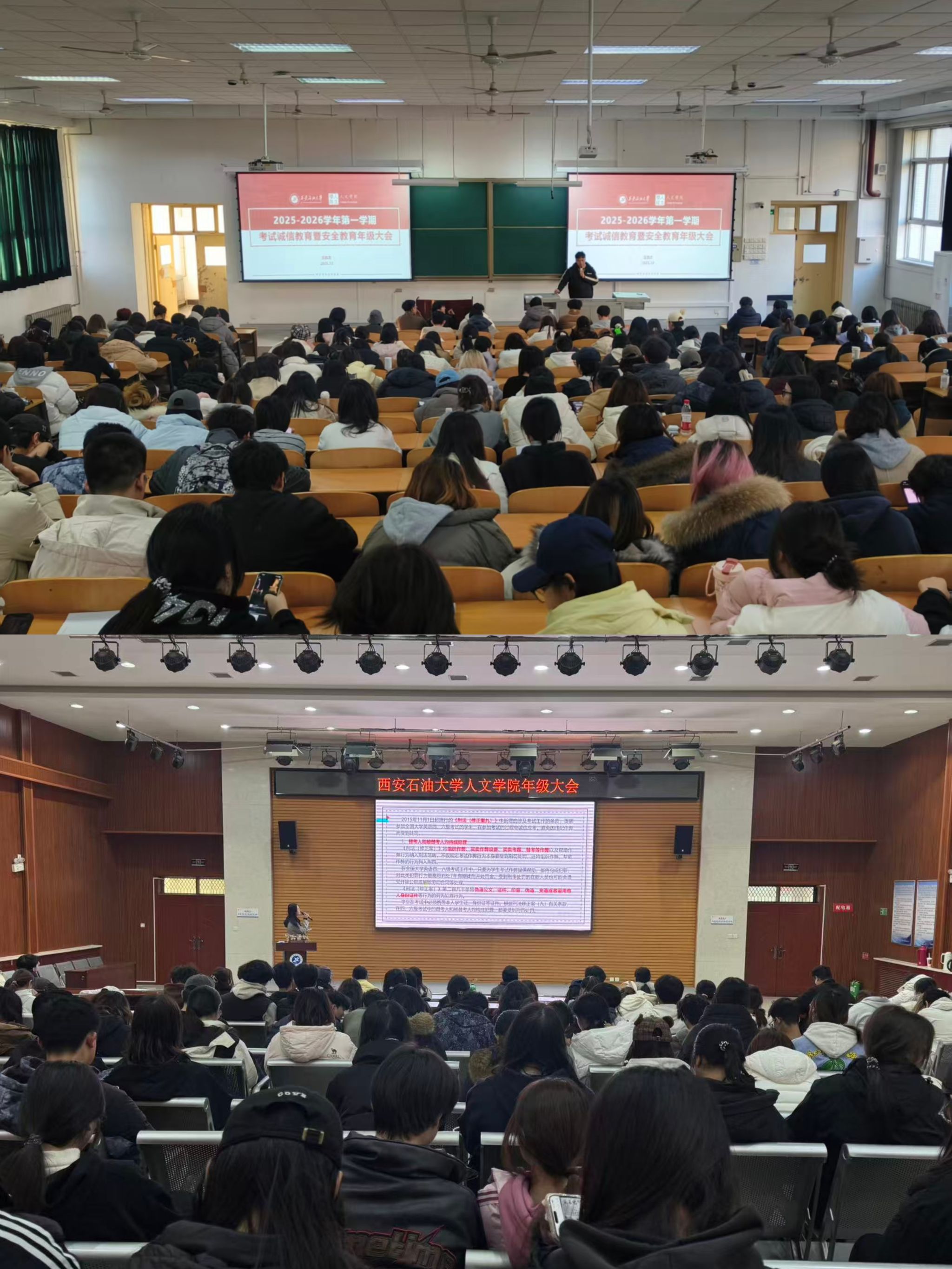 为持续强化学风建设,引导学生端正学习态度,诚信应考,全面增强学生安全防范意识,营造平安、稳定、和谐的校园环境。12月10日至11日,人文学院2023级、2024级分别在鄠邑校区博览楼A234、崇文楼118组织召开了考风考纪暨安全教育年级大会,2023级、2024级全体本科生参会,会议由各年级辅导员主持。