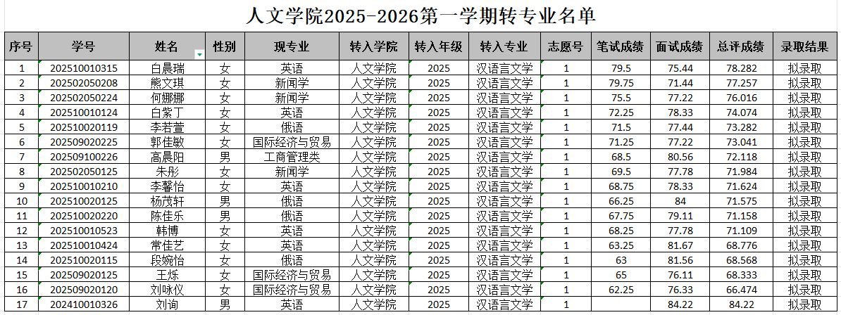 根据《西安石油大学全日制本科生转专业转学管理办法》《西安石油大学关于做好2025-2026学年第一学期本科生转专业工作的通知》及《西安石油大学人文学院本科生转专业实施细则》等相关通知及要求,经本人申请、笔面试考核,人文学院本科生转专业工作领导小组审议通过,现将人文学院拟录取名单公示如下: