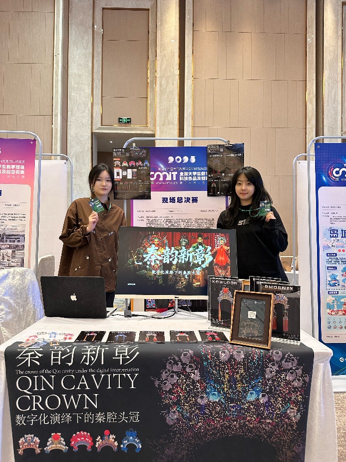 在高手云集的全国总决赛现场,我校学子凭借将传统文化与数字技术深度融合的创新设计脱颖而出。由何奇颖老师指导,艺硕2402班史文婧、王翼鹏同学完成的作品《秦韵新彰——数字化演绎下的秦腔头冠》,聚焦“数字艺术表现”,通过分层设计与动态粒子效果,让静态的秦腔头冠焕发出动态的艺术生命力。由陈庆老师指导,2022级视觉传达设计专业穆子钰、李义蔓、郭燕子同学完成的作品《延川丹彩——陕北匠艺丹青纹样文创设计》,则投身于“民族文化创新表达”专项赛道,对陕北传统纹样进行现代转译,展现了其深厚的文化内涵与时代气息。