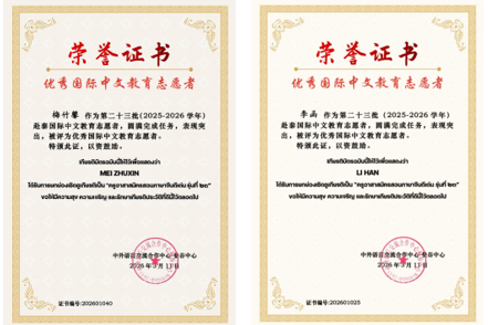 2026年3月13日,在第23批赴泰国际中文教育志愿者离任欢送大会上,人文学院国际中文教育专业2024级硕士研究生梅竹馨、李函荣获“优秀国际中文教育志愿者”荣誉称号。该荣誉由中国教育部中外语言交流合作中心(简称“语合中心”)与泰国教育部联合颁发,旨在表彰表现突出的志愿者,本批次共776名志愿者,84人获此殊荣。